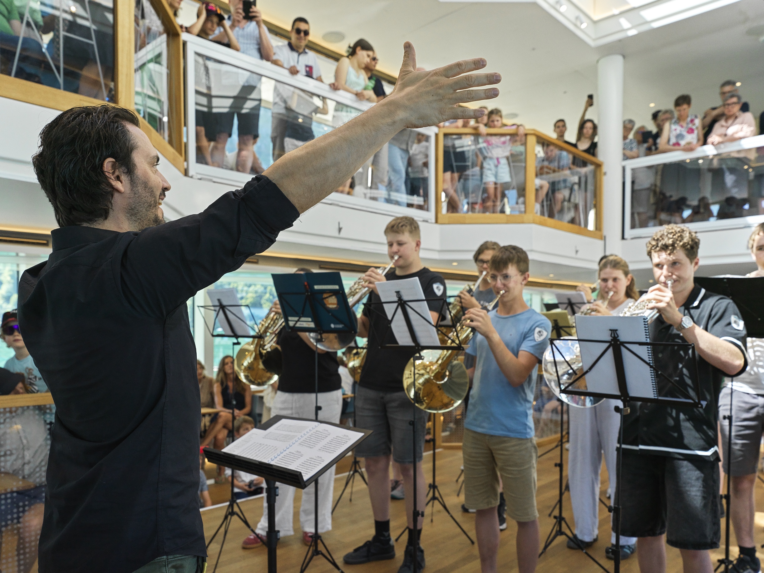 Am Sonntagmorgen präsentierten die Kinder zunächst ein gemeinsames Eröffnungskonzert unter dem grossen Vordach des KKL Luzern, bevor sie zusammen mit ihren Familien und Gästen das Motorschiff Diamant bestiegen. Während der rund eineinhalbstündigen Fahrt erklangen Hornklänge aus verschiedensten Gruppen von klein bis gross, die im Foyer des Schiffs auftraten. Das Alphorn-Trio EIS isch KEIS verzauberte das Publikum zudem auf dem Achterdeck. Das Wetter zeigte sich von seiner schönsten Seite: Bei strahlendem Sonnenschein und sommerlichen Temperaturen wurde das Konzert auf dem See zu einem eindrücklichen Abschluss dieses besonderen Wochenendes.